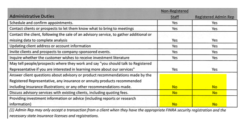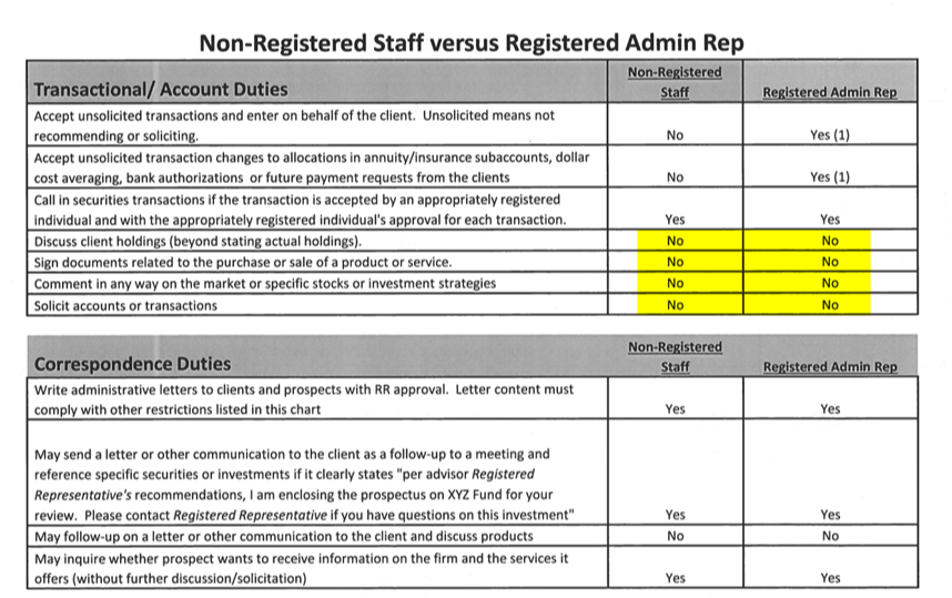 - Non-registered persons may NOT engage in any activities or duties requiring securities or advisory registration.