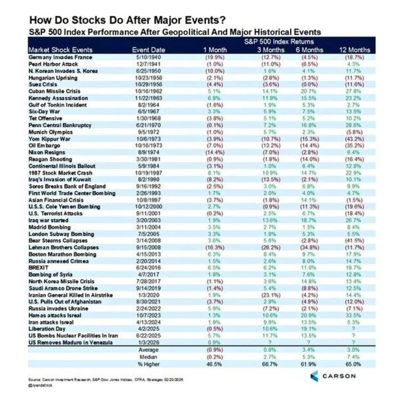 Below is the S&P 500’s performance following major geopolitical events. It is important to note that some of these events coincided with broader economic developments such as shifts in growth, inflation, interest rates, or the COVID pandemic, which also influenced market performance. On average, the index declined approximately 0.9% one month after the event. While double-digit declines did occur in a few instances, they were relatively uncommon and ultimately proved to be attractive buying opportunities for long-term investors. Over time, returns have generally improved, with the index averaging a gain of 0.8% after three months and 3.4% after six months.
