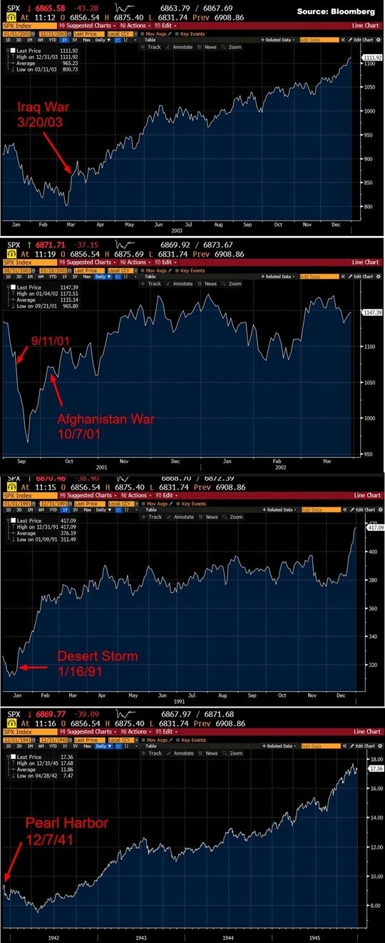 Looking more specifically at U.S. wars below, you can see that although markets often experience a short-term dip as uncertainty spikes at the onset of conflict, they have historically stabilized and, in many cases, moved higher over time. Once the initial shock subsides and the economic implications become clearer, wartime spending—particularly in areas like defense, manufacturing, technology, and infrastructure—can stimulate economic activity. Increased government expenditures, industrial production, and employment have often contributed to broader economic expansion, helping markets recover and, in certain periods, perform strongly despite the ongoing conflict.